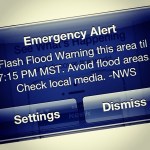 Thirty minutes later, my cell phone bleeps louder than a sheep caught in barbed wire. A text follows the screeching alarm: Rain Storm Ahead – Flash Flooding.