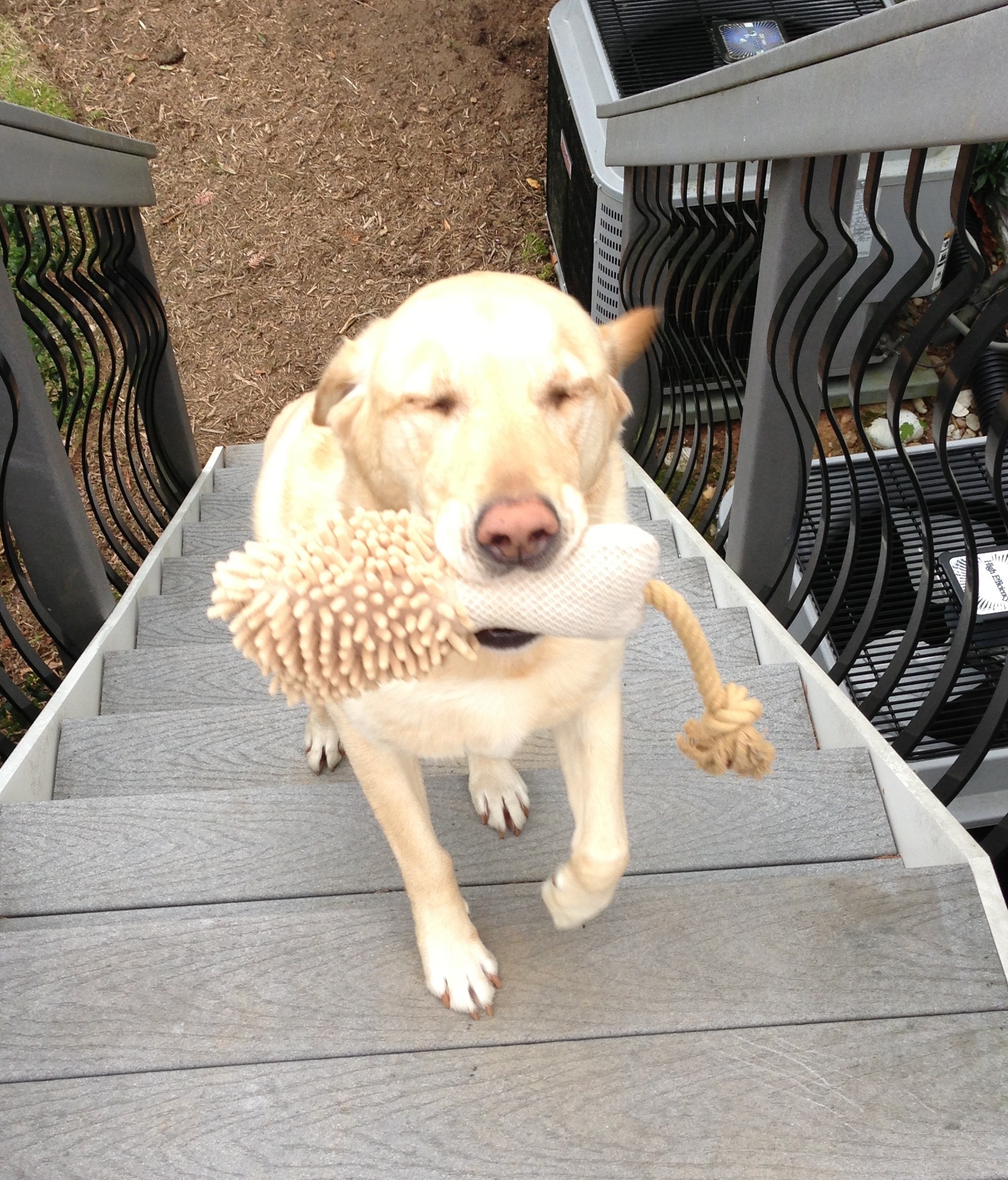 Oliver brings me his special stuffed muskrat. friendship, dogs, dog toy